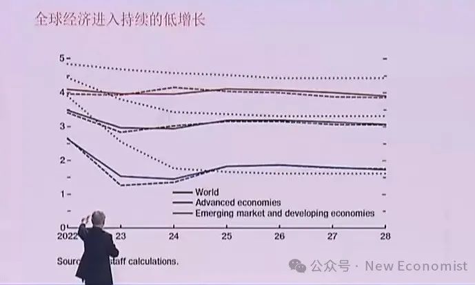 全球经济持续低增长,大家可以看到2022年经济反弹,当中是黑的是全球,这是发达国家,前面是发展中国家,红的,2024年有一点的反弹,2025年现在看来基本和2020年持平,本来预测还有点前进,基本就持平,然后缓缓地还是往下走,整个经济在今年也就是2.7左右的增长,明年也就是2.7-2.8左右,大概会维持在这个水平在今后3-5年左右的时间,这是一个相对比较低的全球增长水平。