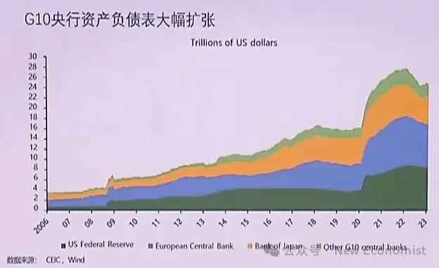 所以我们可以看到,我们以美联储为例,2008年的时候,当初美联储扩张的这一节,从0.7万亿美元左右的资产负债表涨到了1.4,翻了一番,我们都觉得了不得的太厉害了,以后逐渐上升,2020年大家可以看到,美联储一下上升一大截,灰的是欧央行,黄的是日本。