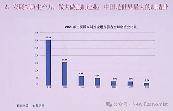 第二个就是,我们的核心竞争力是制造业,做大做强制造业,中国的制造业占全球制造业的30.3%左右,中国的制造业是美国、日本、德国和韩国的总和,我们占了30.3%,他们4家占了29.9%。特别是疫情以来,我们充分意识到我们的核心竞争力其实是制造业。改革开放40年前20年,我们把中国的制造业做成了世界上最便宜的制造业。改革开放的后20年40年里,我们把它不但作为便宜,而且做成世界便宜又好的制造业。未来20年,中国的制造业变成又便宜又好又高科技的制造业,而且我们希望能够维持着30%的比例不变,中国的制造业打遍天下无敌手,这是一个重大的战略变化,也是我们未来经济发展的一个特别重要的变化。