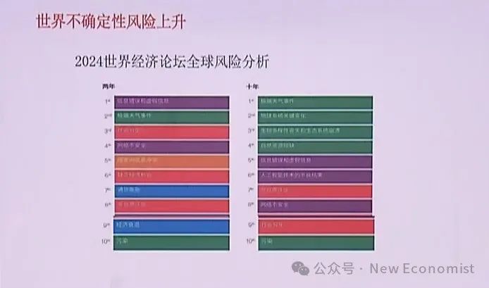 世界经济论坛论坛最近发布了2024全球金融风险报告,我是世界经济论坛的董事,做了20年了,所以我也知道这个报告,但这个报告出来以后我特别的惊讶,大家可以看到,未来两年主要的风险是什么?是信息错误,极端气候、社会分化、网络不安全,国家间的武装冲突,第六是经济机会,第七是通货膨胀,第九是衰退。未来两年全球十大经济金融风险,3个是经济,7个是政治,未来10年,极端气候、生物多样化、资源、信息、人工智能、移民、网络、社会分化、污染,没有一项是经济。