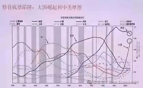 美国从1760年建国以后经济走得非常快,第二次世界大战以后美国成为世界上最大的经济体,现在随着中国起来也逐渐下降,中国从明末,红线,一直是世界最大的经济体,在清末逐渐下降,新中国成立,改革开放以后,中国急剧上升,现在这两根线要碰到,美国人说这是修昔底德陷阱,所以中国挑战美国不可避免。中国说我们是追求我们共同利益的命运共同体,但是这两个文化的冲突还是很大。